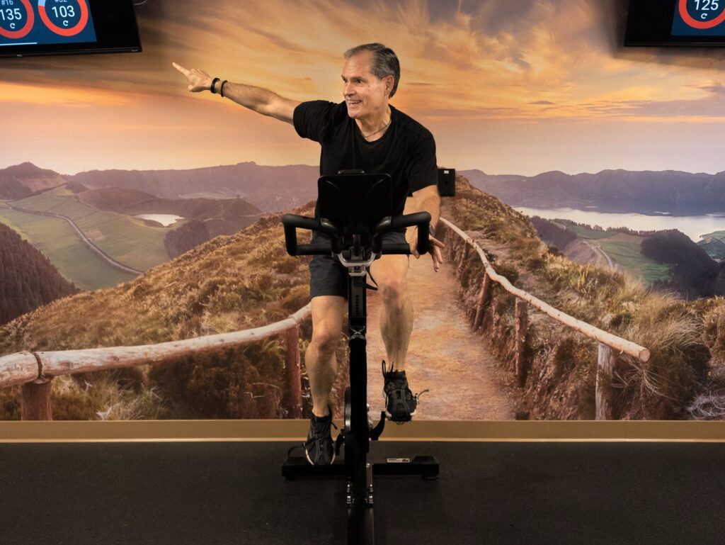 An immersive spin experience featuring a darkened studio, dynamic color lighting, and a striking wall mural – all designed to inspire you to push further, whether you’re a beginner or experienced rider.